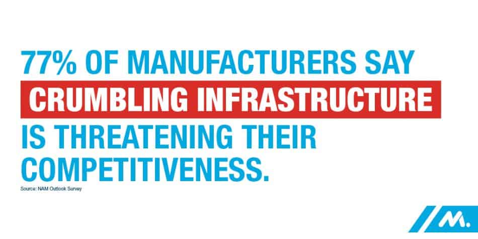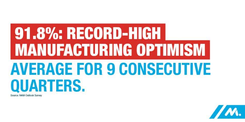 Empowered by tax reform and regulatory certainty, manufacturers are investing in our communities and in our people. Our latest Manufacturers’ Outlook Survey shows nine consecutive quarters of record optimism, with an average of 91.8 percent of manufacturers positive about their own company’s outlook over that time frame, compared to an average of 68.6 percent across the two years of 2015 and 2016. Manufacturers’ top concern remains the inability to attract and retain a quality workforce, and concerns about our nation’s crumbling infrastructure continue to rise.
