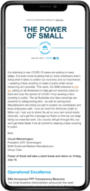 Power of Small — A weekly email newsletter that provides resources and actionable intelligence for small and medium-sized companies on everything from loan programs and regulatory changes to workforce strategies, as well as inspiring stories showcasing the powerful leadership of small manufacturers.